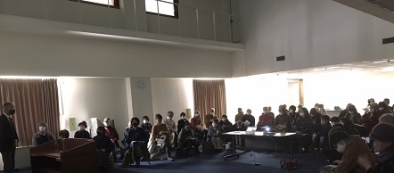 写真は学習会で語る小出裕章さんと息をのんで聴くみなさん。プロジェクターの画面をはっきり見ようとすると、会場の電灯はくらいのです。くらいなか、熱を発する人の群れ。夜の熔岩のようでした。