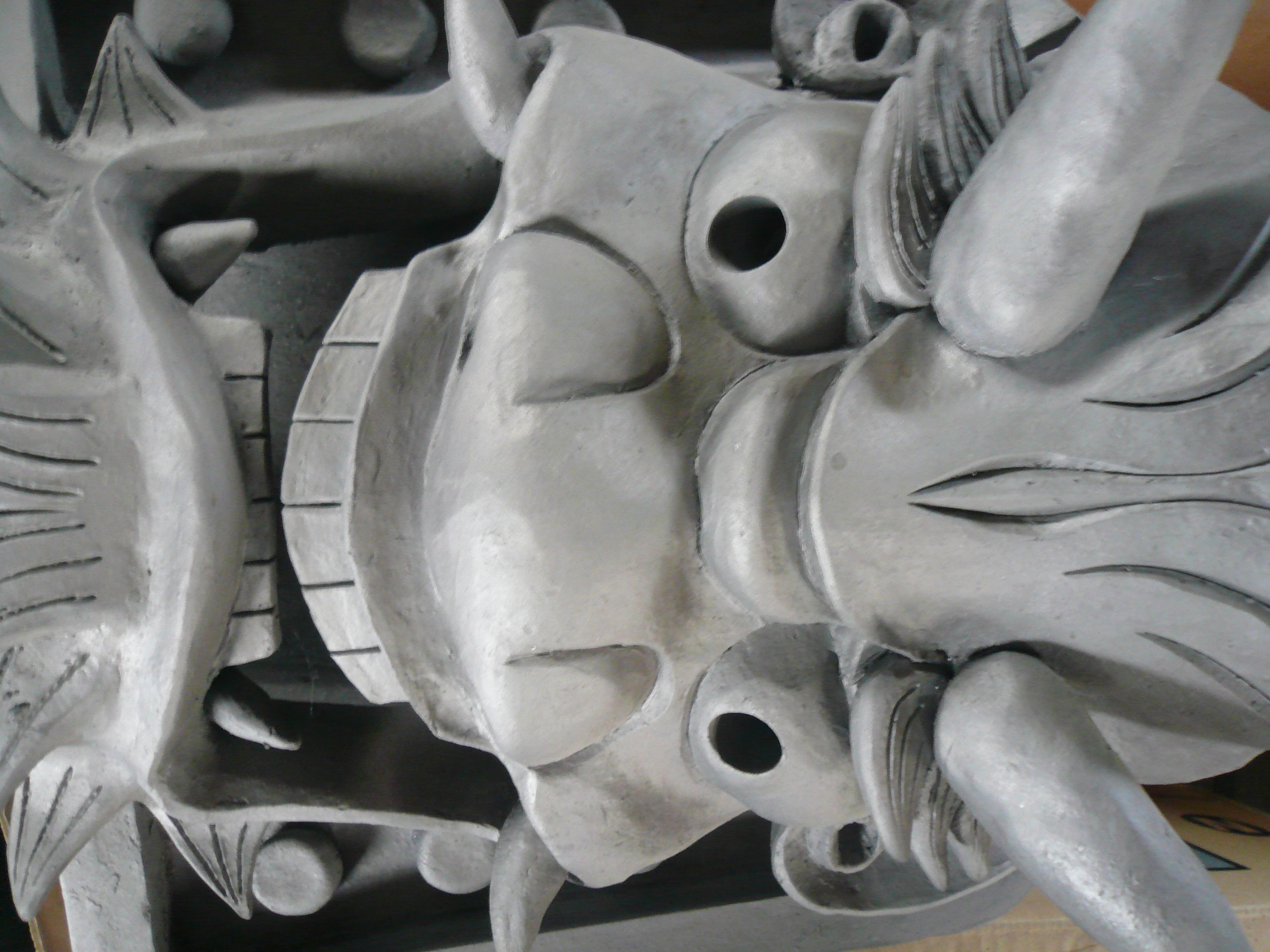 床に積み上げられていた鬼瓦。魔なるものを、にらみつける目。