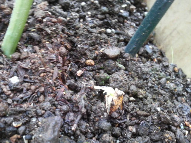 種をまいてからほったらかしにしてあきらめて3週間、いやもうひと月になる頃だろうか。今朝みたら、大きな種のからをあたまにのっけたまま、もこもこと芽が土に顔を出してきた。
