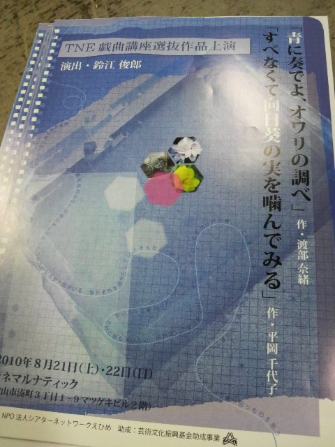 松山での戯曲講座を積み重ねてきて三年目。ついにここから劇作家をデビューさせようという試みです。ふたりの作品を上演します。鈴江が担当してきた戯曲講座の中から生まれた二つの作品を鈴江が演出するのですから責任重大。身が引き締まる思いです。出演は地元松山の役者たち。生演奏のバイオリニストも参戦します。松山はすぐそこ。船もある飛行機も飛ぶ。なんと電車などは大きな橋で海をそのまんま渡ってきてしまいます。どしどしご予約を!Email:tne0630@yahoo.co.jp