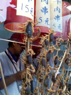 写真は北京の市場で売ってたさそりの串揚げ。