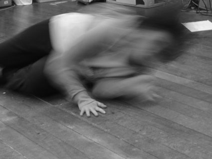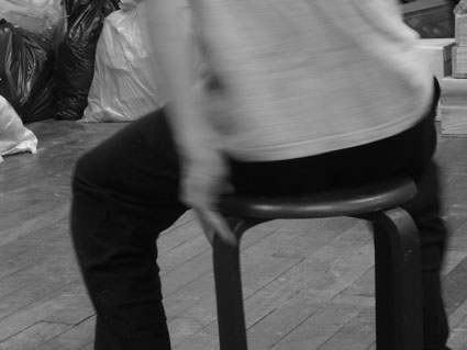 車座になって30名弱の役者たちが座る。その取り囲む中で二人の役者が演じてみせる上演会。素舞台、照明は天井の室内灯。役者はジャージ。
