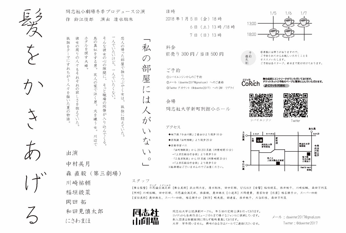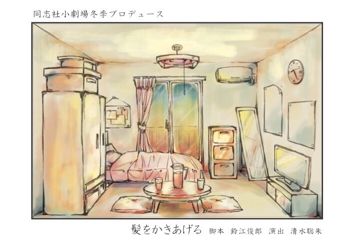 街の風景がかすんでいて色あせている。このDMの部屋のスケッチはだれかスタッフ、出演者のだろうか。現実感阻喪の症状のようで、京都の街、私の部屋、……だけどほんとに私のだろうか、って考えてしまうような不思議な時間、だろうか。