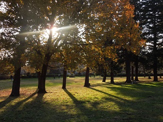 夕方。冬の光線は弱いのに、木の影がこんなに芝の上に濃い。