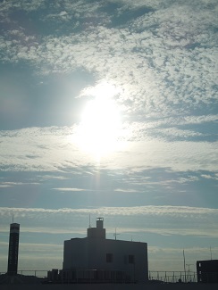 日本海側の秋の光線。太陽は霧の向こうでまるいかたちが白く見えます。