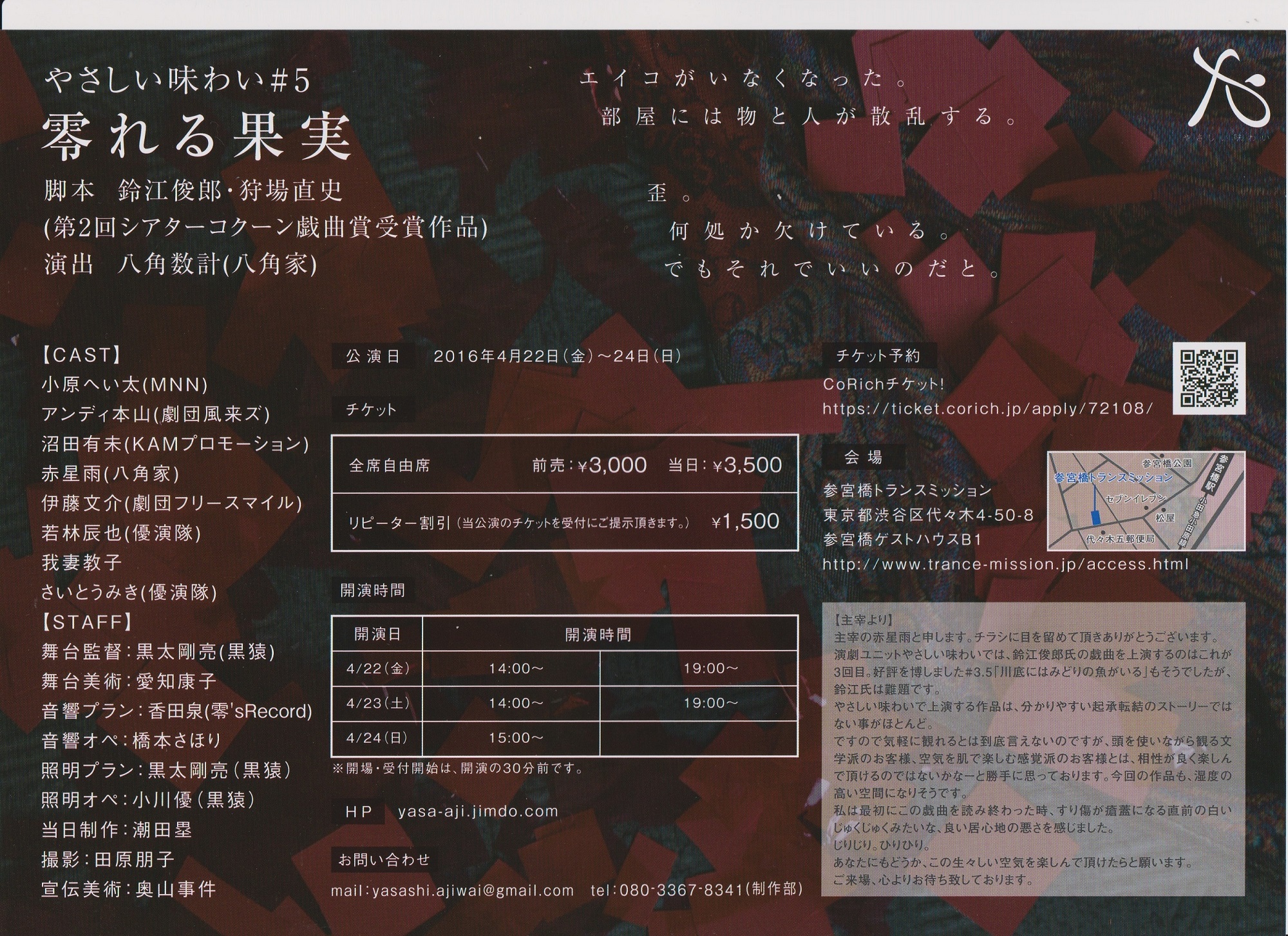 心の模様があざやかにきりとられたチラシ。このチラシの文章にもあるが、まことに「気軽に見れる」というわけでもない作品の上演に挑んでくれるこの志がうれしい。