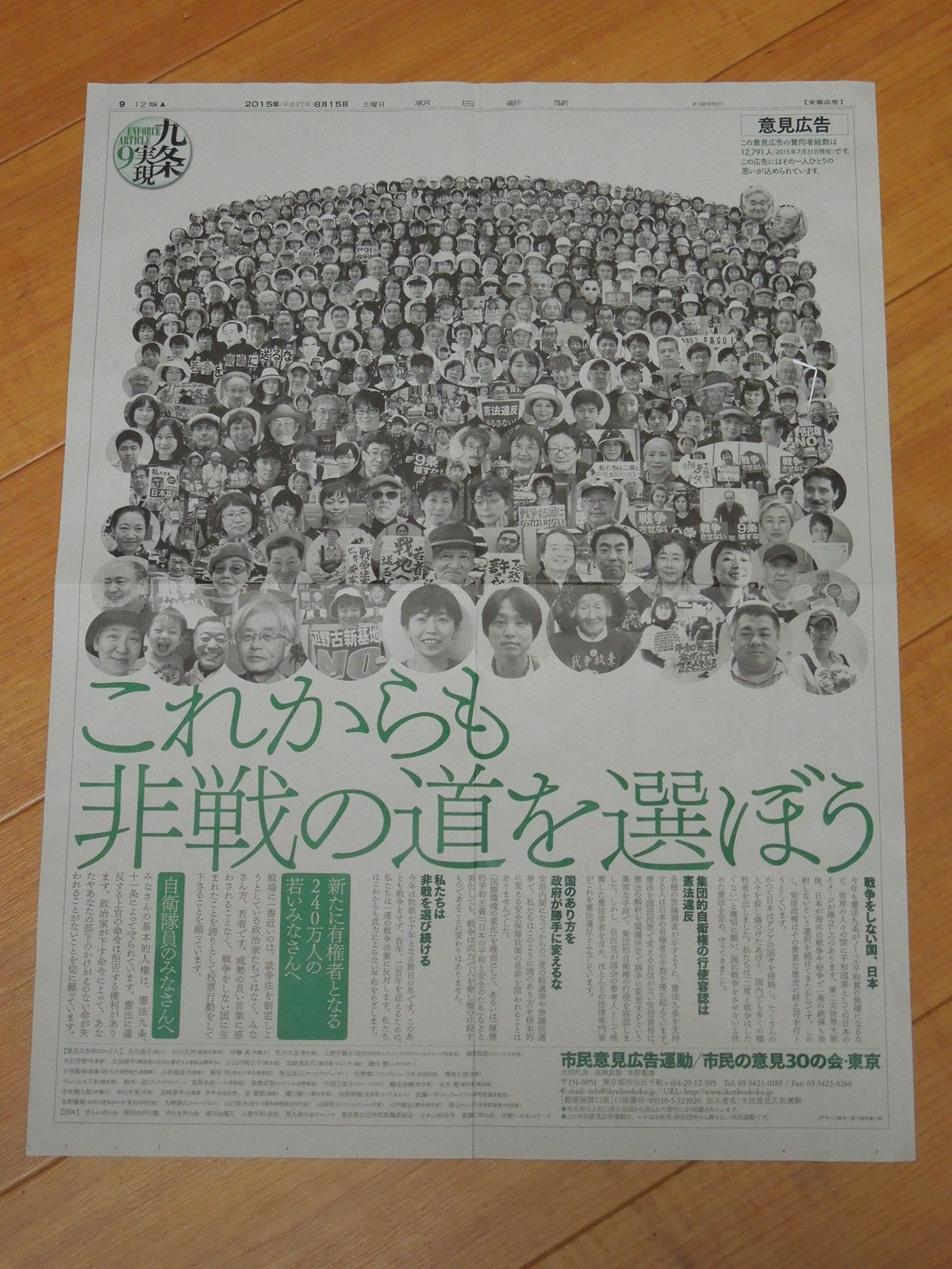 去年は5月3日に「総理!そんなに戦争したいですか?」を、8月15日に写真のような広告を、さらに海外の新聞にもだした。広告料がかかる。それを集める運動だ。戦争を止めよう。原発をやめよう。私は賛同している。