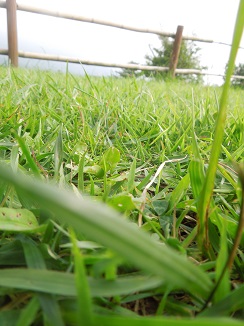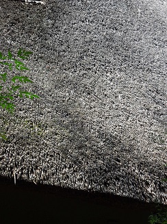 炎熱をうけているのにその下をひんやりさせているかやぶき屋根。
