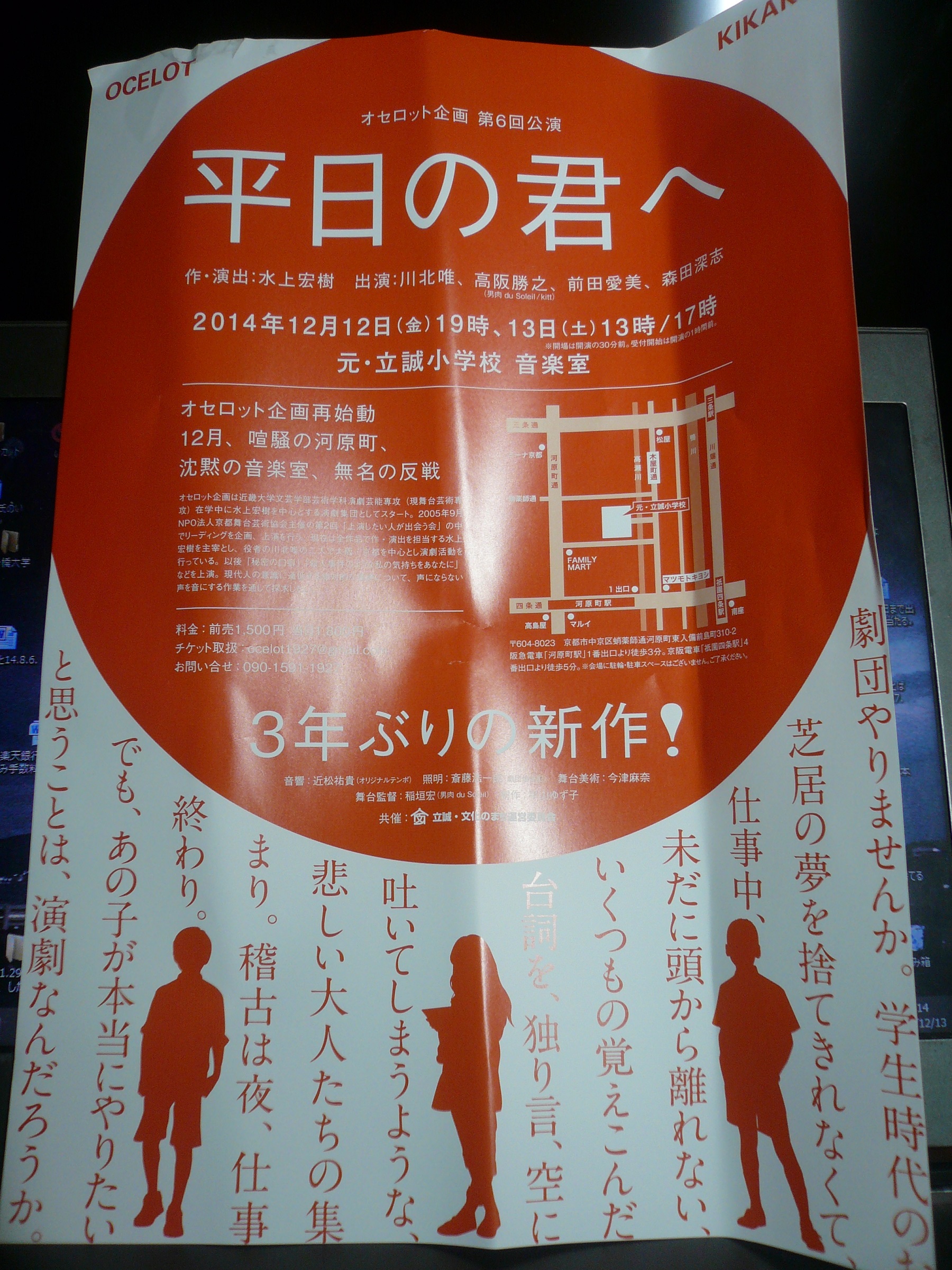短大一年生の演技発表会が終わった。お客さんが退場するそのときみんなが舞台を見上げると、頭上にジャージが。照明をぶら下げる単管にジャージが。ラストシーンで役者がほおりなげたものだ。気合いを示すためにソフトボール選手が脱ぎ捨てる。「天井にひっかかるくらいの勢いで!」とは要求したが、ほんとにひっかかってしまったのは初めてじゃないだろうか。スタッフの方々申し訳ないです。演出家が悪いのです申し訳ありません。