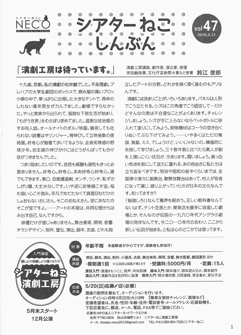 シアターねこしんぶんに記事を書かせてもらった。ちょっと力みすぎた文章になってしまった気がする。だけどまあ思いをありのままに書いたことは間違いない。仲間になって一緒に汗をかく人を募集してます。